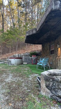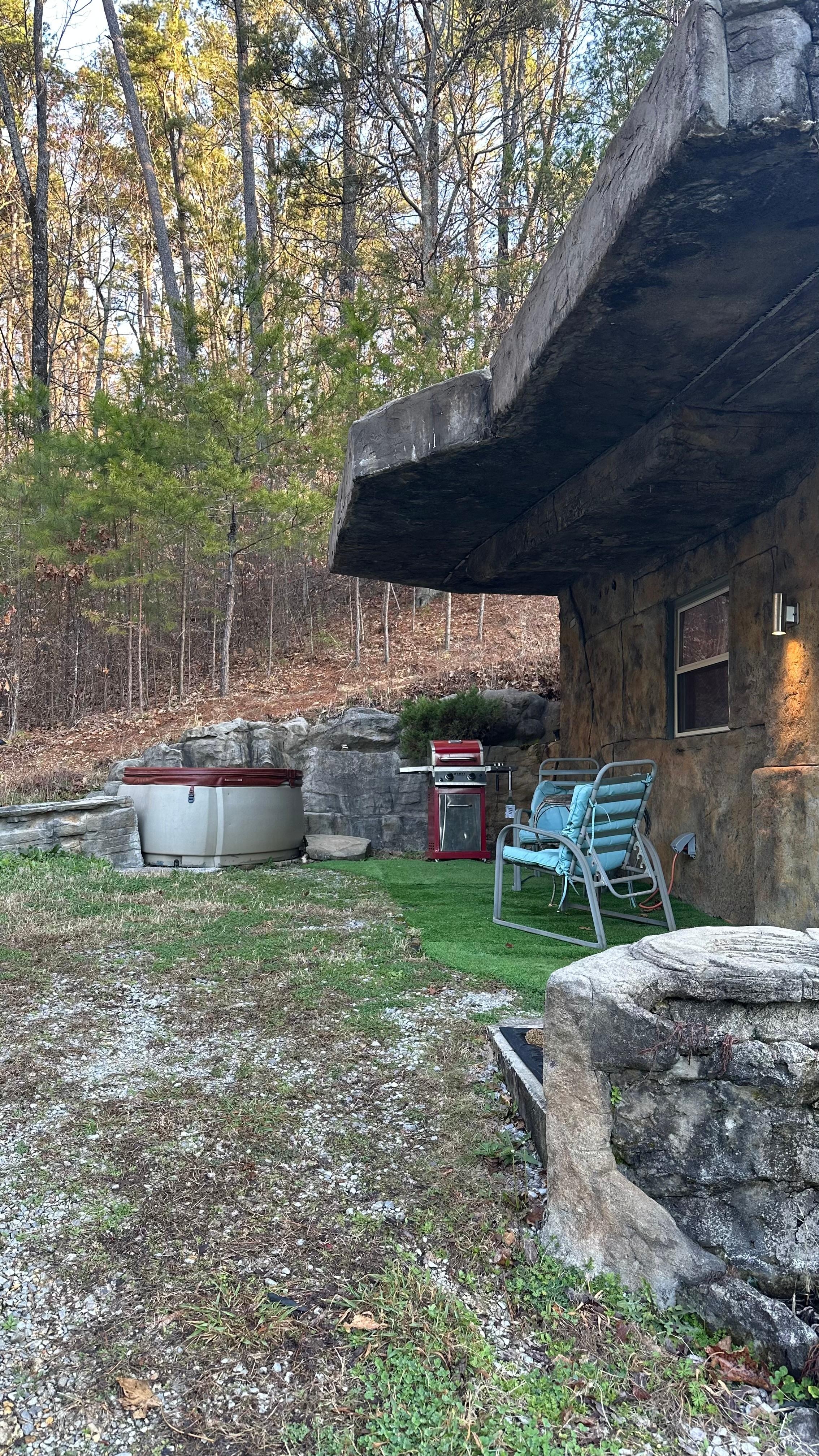 This is our first of two hand-carved, ruins style cottages. The other one, (The Cavern on The Green, vrbo#1298361) is next door. These cabins are in a private section of a 12 acre property. Both cabins are arranged to have outdoor private areas out of view. The land is at the foot of lookout Mountain and is a great venue for outdoor gatherings. We have a choice of bonfire spots and plenty of room. You'll need to contact us in advance for info on hosting a function here.