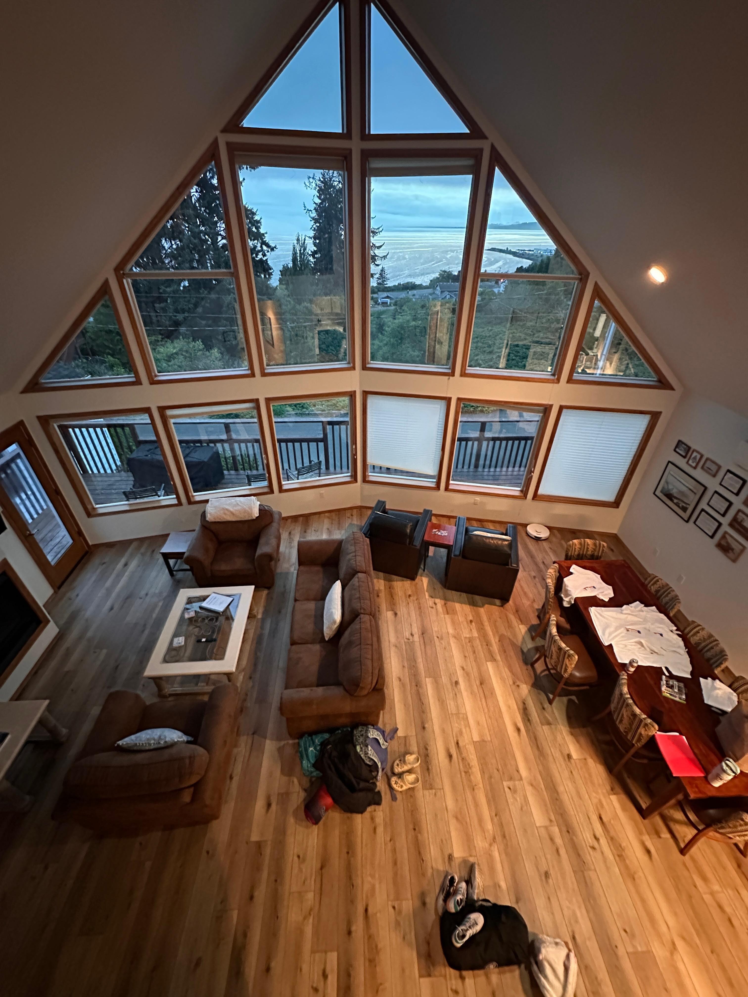 INDOOR LIVING: Smart TVs, fireplace, dining table, ceiling fans, carpet flooring, en-suite bathroom, wall of windows w/ bay views