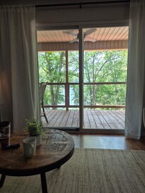Lakefront retreat with screened sunroom, wood stove, multiple decks, & AC