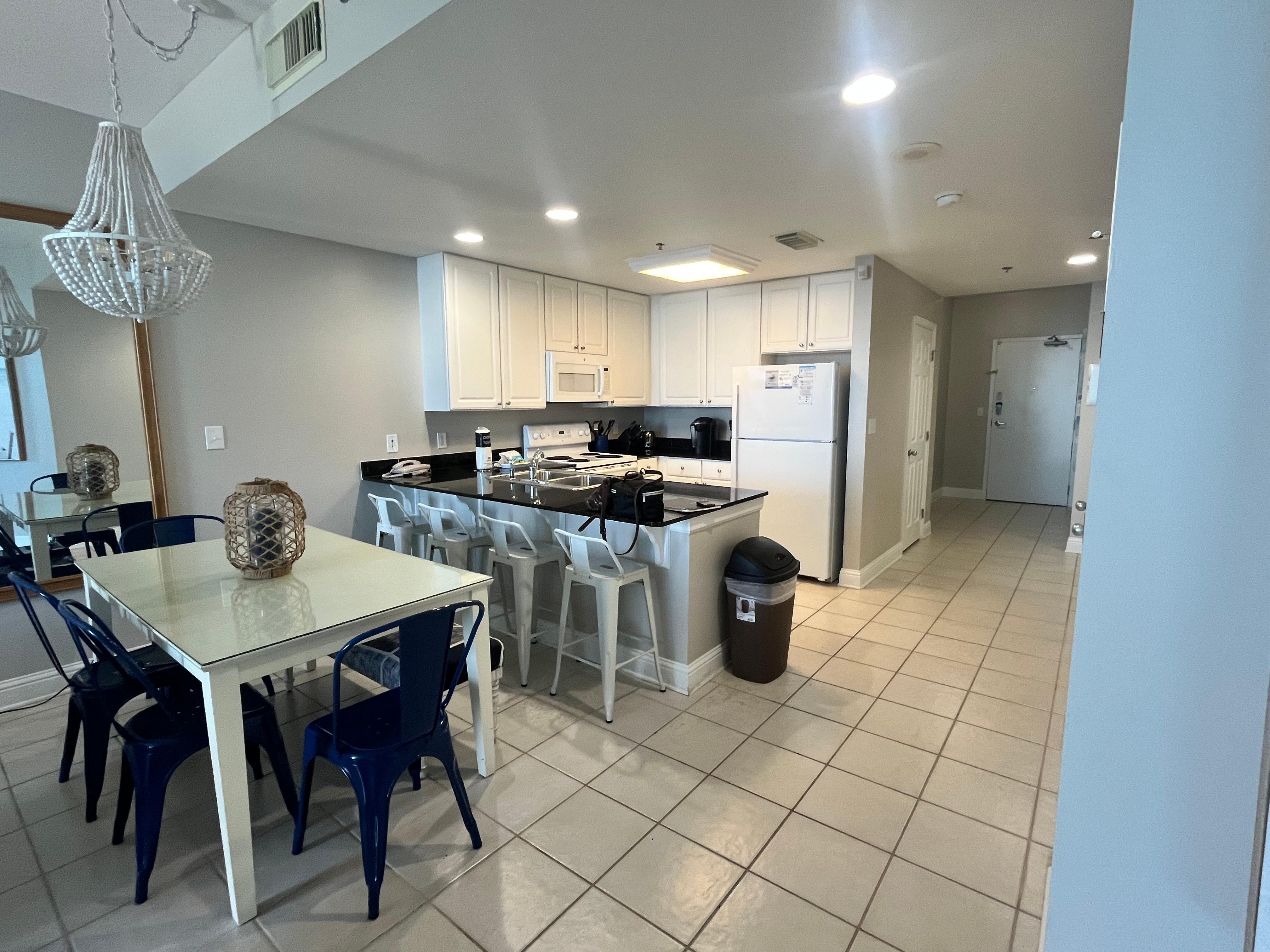 ⹠Cuisine entiÚrement équipée avec comptoirs en granit, salle à manger pouvant accueillir quatre personnes avec trois tabourets de bar supplémentaires.