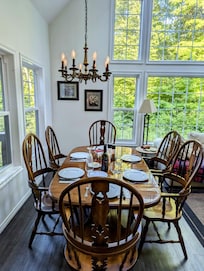 From the kitchen, walk out to the deck where meals cooked on the propane BBQ , can be enjoyed either outside at the picnic table, or inside at the large dining table.