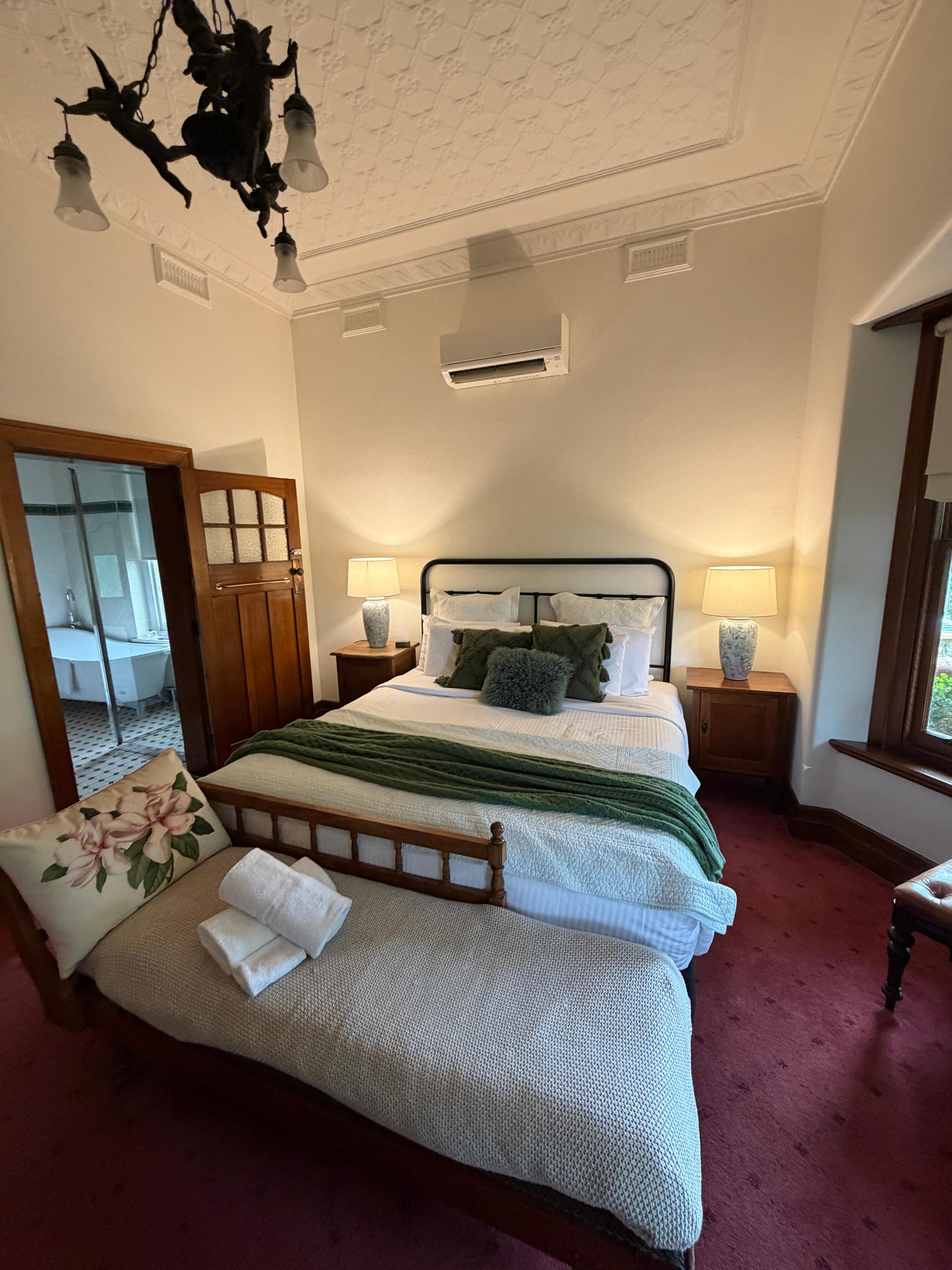 Green Gables King Suite offers a peaceful, stylish retreat in Castlemaine. Relax in a luxurious king bed, enjoy the private ensuite, and unwind with tea or coffee in the cozy sitting area. Filled with natural light and elegant décor, the suite is perfect for couples or solo travelers seeking comfort, tranquility, and a convenient base to explore local cafés, galleries, and parks.