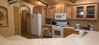 La cuisine spacieuse est entiÚrement équipée avec un lave-vaisselle, micro-ondes, réfrigérateur et congélateur, cuisiniÚre avec four ainsi que la cuisson et les ustensiles de cuisine pour cuisiner de délicieux repas lors de votre séjour à Cowboy Cabin. Le concept ouvert vous permet de profiter de vos invités tout en cuisinant et en prenant soin de la vaisselle. Un grand bar est situé dans la cuisine pour fournir un espace de comptoir supplémentaire et des siÚges pour quatre personnes. La salle à manger attenante offre une grande table à manger avec des siÚges pour quatre avec une vue magnifique sur l'arriÚre-cour.