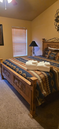 La chambre principale offre un lit king-size et beaucoup d'espace pour déballer vos sacs et se sentir comme à la maison. Détendez-vous aprÚs une longue journée d'exploration tout en regardant la télévision à écran plat. La salle de bain complÚte dispose d'une belle décoration et toutes les commodités dont vous aurez besoin pendant votre séjour. Les draps et les serviettes sont fournis pendant votre séjour à Cowboy Cabin.