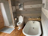 On the main floor you’ll find the kitchen with ample counter space and essential appliances and cooking utensils. The open concept dining/living area is perfect for having dinners, playing card games, or relaxing. Enjoy all the comforts of home with the spacious bathroom featuring a clawfoot tub, tiled shower and indoor plumbing (if needed, there is also an outhouse outside). Stay cool in the summer months with two AC units.