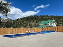 ~Pool & Hot Tub Patio~ Our pool and hot tub patio is a shared space with your host and other guests. It is located about 500 meters away from Sagebrush Caboose, by your hosts' house. You will find a large, heated saltwater pool (open seasonally from mid-May to mid-September) which is about 2.25 meters deep at one end and 0.75 meters deep at the other. You're welcome to enjoy our spa which is large enough for 5 people and has 64 jets, led lights, and a waterfall. Also in this patio space is a pool house where you can change, multiple seating areas with umbrellas, sun loungers, towels, and many pool toys and floaties.